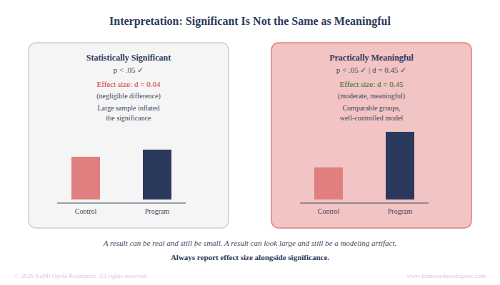 A statistically significant result does not automatically mean the program worked in a meaningful way. Effect size matters. Statistical power also matters. Whether the comparison group was truly comparable matters. Whether the outcome was measured at the right time matters.