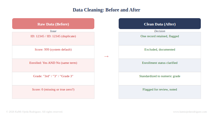 Once we have the data, is time to do some cleanup because raw data is rarely (mostly never) ready to analyze. There are duplicate records, impossible values, missing entries, and inconsistent coding. A student listed as both enrolled and not enrolled in the same semester. A test score of 999 that is clearly a system default, or a 0 that does not mean the students does not know anything but perhaps something happened. Grade levels coded differently across years.