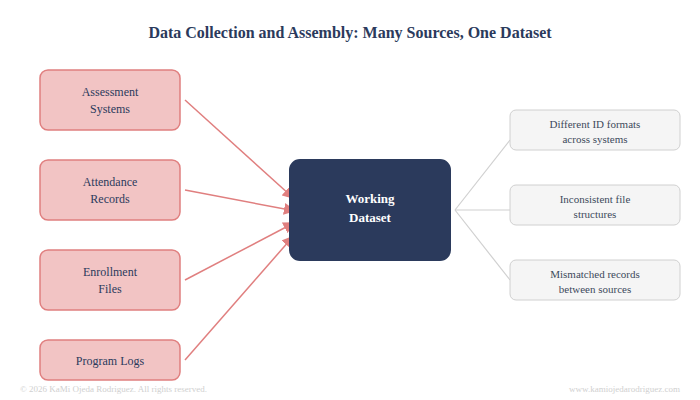 Once the question is set, you need the right data to answer it. That means identifying every source: assessment systems, attendance records, enrollment files, program logs. Then it means pulling those sources together into a single working dataset, which almost never happens cleanly. Different systems use different student ID formats. Files are exported in inconsistent structures. Records from one source do not always match records from another. Assembling usable data takes time and precision before a single analysis step runs.