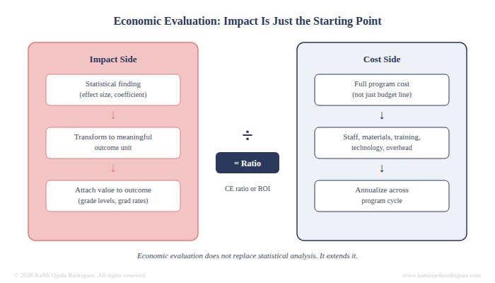 This is where economic evaluation begins. Once an impact estimate exists, it often needs to be transformed before it can be used in a cost analysis. A standardized effect size may need to be converted into a meaningful outcome unit. A gain score may need to be translated into something stakeholders can attach a value to, like grade level equivalents, projected graduation rates, or avoided costs downstream.