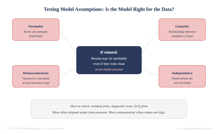 Every statistical model rests on a set of assumptions about the data. That errors are normally distributed. That the relationship between variables is linear. That variance is consistent across the range of the outcome. That observations are independent. If those assumptions are violated, the model's results may be unreliable, even if they look clean on the surface.