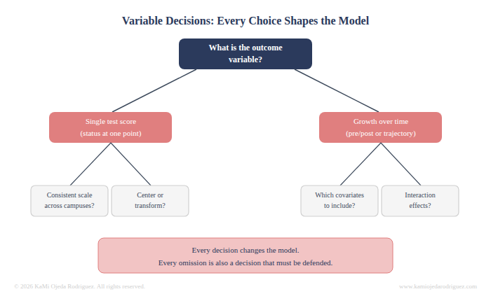 What about the outcome variable itself? Is a single test score the right measure, or do you need to look at growth over time? Are the scores consistent across campuses or did different schools use different assessments? Do variables need to be rescaled, centered, or transformed before the model runs? These are not small questions. They shape what your results can and cannot say.