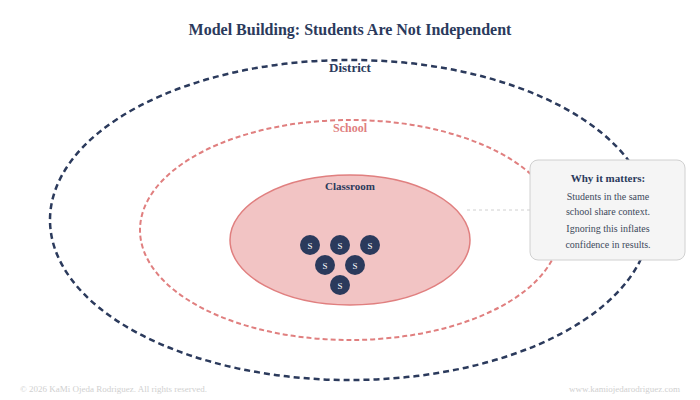 How do you handle the fact that students are grouped inside schools? A student in a high-performing school is not statistically independent from their classmates. Ignoring that structure inflates your confidence in the results. Accounting for it requires a different modeling approach entirely.