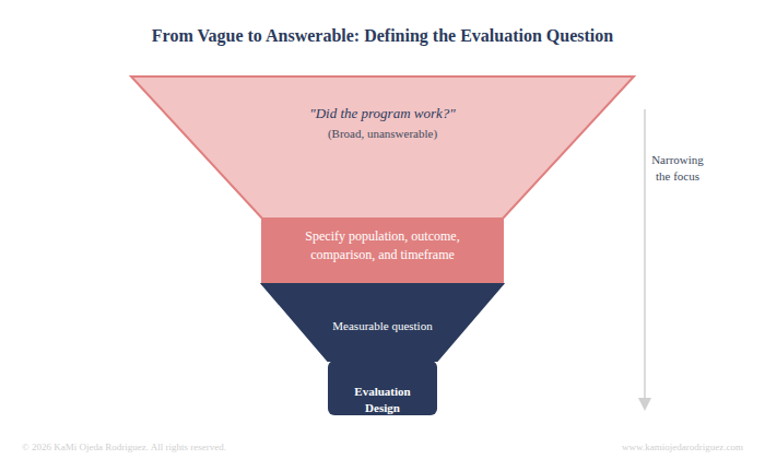 This initial question drives everything else in the evaluation process: from the method, the variables, the sample, the comparison, to the interpretation and ultimately the findings.